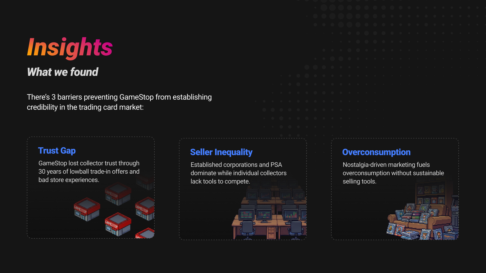 We analyzed primary community sources across Reddit, X, Discord, and dedicated TCG forums to understand how collectors talk to each other. Jon supplemented this with secondary research on selling behavior and relevant academic studies, which helped validate patterns we observed.