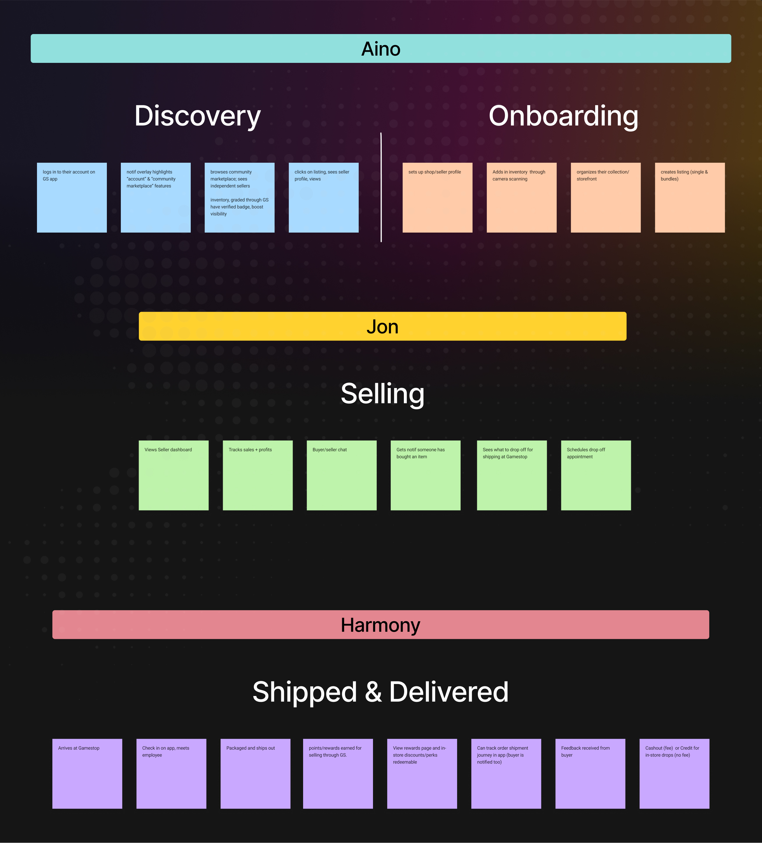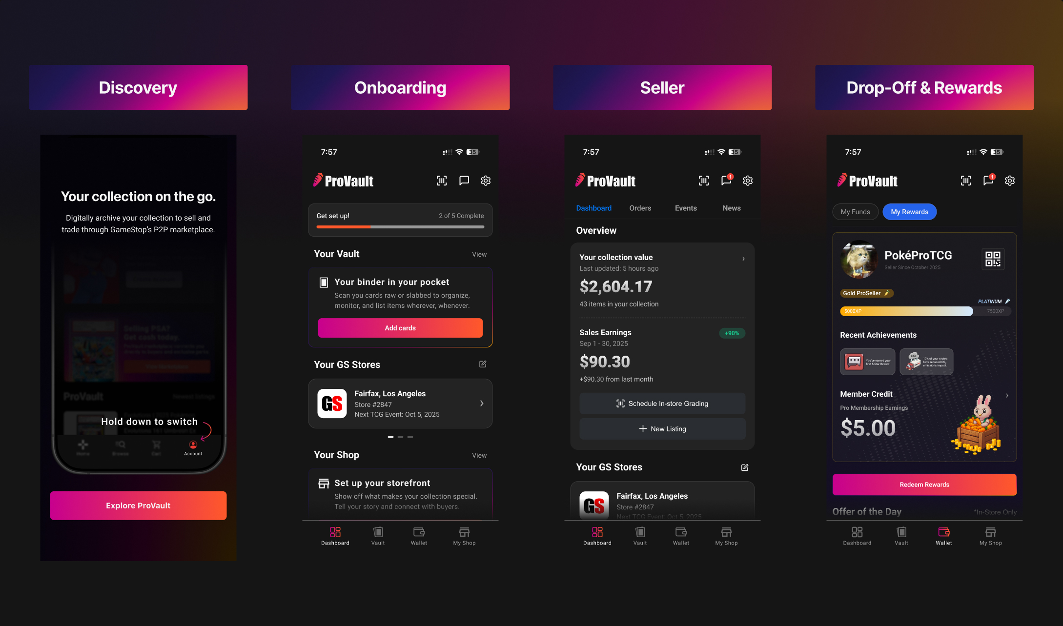 We mapped the end-to-end ProVault journey to capture user intent at each phase, from discovery and onboarding through listing, negotiation, and drop-off. The goal was to make the path from “I might sell” to “I got paid” feel predictable, with clear trust checkpoints that move users into a GameStop store for verification.