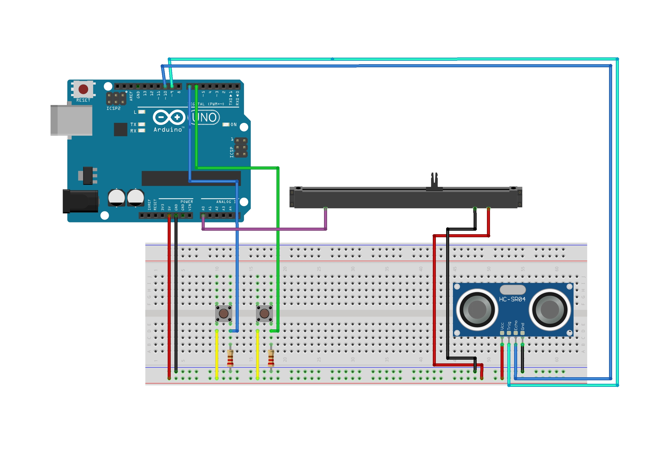 I began the build by wiring the physical interface, connecting two tactile buttons, a fader potentiometer, and the HC-SR04 ultrasonic sensor to the Arduino Uno R4 WiFi.